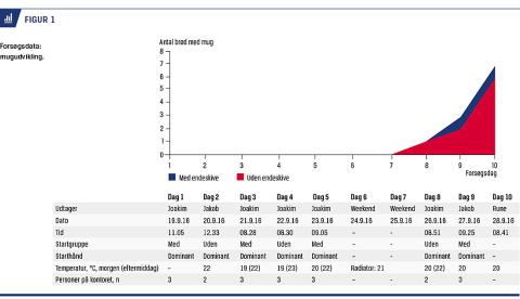 Ved forsøgets afslutning var der i alt mug på hhv. syv og seks af brødene i poserne med og uden endeskive (p = 1,00).