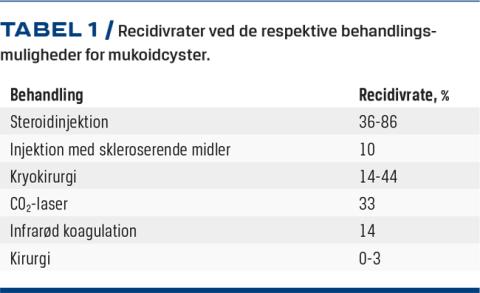 Mukoidcyster er en hyppigt forekommende benign tumor [1], der har en god prognose ved kirurgisk behandling [23, 26, 27]. Den præcise prævalens kendes ikke, da mange patienter med asymptomatiske mukoidcyster ikke henvender sig til en læge. Desuden bliver patienterne set og behandlet i flere specialer. De fleste studier er casestudier eller retrospektive studier. Mukoidcyster kan også forekomme i tæerne, hvor behandlingen er mere kompliceret end i fingrene [1]. Mukoidcyster kan i nogle tilfælde være lokaliseret under en negl og være vanskelige at diagnosticere. Neglen fremstår typisk dystrofisk og har som regel en longitudinel fure [1]. Med MR-skanning kan man diagnosticere mukoidcyster lokaliseret under neglen. Hvis mukoidcyster under neglen giver symptomer, bør de behandles kirurgisk [10, 28].