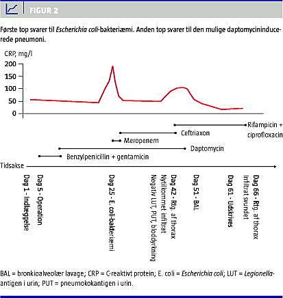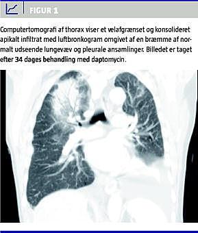 Fire uger efter påbegyndt daptomycin kom på ny CRP-stigning til over 100, og patienten udviklede dyspnø. Røntgen og computertomografi (CT) af thorax (Figur 1 ) viste et velafgrænset konsolideret apikalt infiltrat med luftbronkogram omgivet af en bræmme af normalt udseende lungevæv og pleurale ansamlinger. På mistanke om atypisk pneumoni erstattedes ceftriaxon med ciprofloxacin og rifampicin. To dage herefter seponeres daptomycin som planlagt efter i alt fem ugers behandling (Figur 2 ). Legionella - og pneumokokantigen i urin (LUT og PUT) samt bloddyrkning var negative. Man fortsatte dog behandlingen for mistænkt atypisk pneumoni. Patien-ten fik det bedre, og CRP faldt fra 105 til 18 i løbet af 14 dage. Bronkioalveolær lavage (BAL), der blev foretaget fire dage efter seponering af daptomycin og seks dage efter opstart med ciprofloxacin og rifampicin, viste normale makroskopiske forhold. De mikrobiologiske og patologiske undersøgelser af bronkialsekretet og børstebiopsi viste ingen mykobakterier, cancer eller eosinofile celler. Der blev desværre ikke udført undersøgelse for atypisk pneumoni på bronkialsekretet. Kontrolrøntgen tre uger efter seponering af daptomycin viste, at lungeforandringerne var svundet. Under hele forløbet var serumleukocytter og -eosinofilocytter i normalområdet.