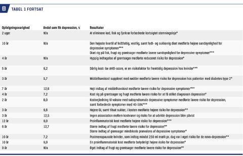 I flere af studierne har man undersøgt effekten af middelhavskost og fundet, at dette kostmønster var associeret med en lavere risiko for udvikling af depression. I et studie [18] fandt man en association mellem komælkindtag og risiko for de novo-depression. I to studier [16, 19] blev det påvist, at såkaldt proinflammatorisk kost var forbundet med en betydeligt højere risiko for at få depression.