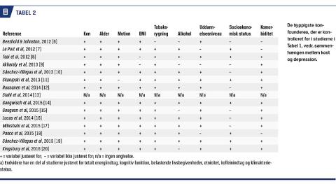 tionel vestlig kost, der er kendetegnet ved en stor andel af animalske og forarbejdede fødevarer. Denne sammenhæng bestod også efter, at der var kontrolleret for konfoundere som socioøkonomisk status, BMI, rygning, fysisk aktivitetsniveau, komorbiditet og andre forhold, som kunne påvirke risikoen for udvikling af depression. I Tabel 2 er der givet en oversigt over de konfoundere, som der er kontrolleret for i de i Tabel 1 viste undersøgelser. I et enkelt studie fandt man ingen association mellem kost og udvikling af depression [15].