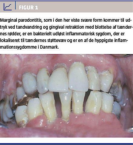 MP er en bakterielt udløst inflammatorisk sygdom, der er lokaliseret til tændernes støttevæv, dvs. gingiva, parodontalligament og knogle, som ofte også medfører et systemisk inflammatorisk respons, f.eks. med forhøjet CRP [2, 6, 9]. En lang række bakterier kan bidrage til MP, herunder fakultativt anaerobe gramnegative bakterier som Porphyromonas gingivalis, Aggregatibacter actinomycetemcomitans og Prevotella intermedia. Bakterierne organiserer sig i biofilm, som breder sig ned i den gingivale sulcus mellem tænderne og den omgivende slimhinde, ledsaget af en kompleks inflammatorisk proces, som i undertiden medfører destruktion af gingivalt bindevæv, parodontalligament og knogle med udvikling af fordybede tandkødslommer (pocher) og tandfæstetab (Figur 1). Den ekstracellulære matrix, som omslutter bakterierne i biofilm, beskytter dem imod både værtens immunforsvar og behandling med antibiotika. Sygdommen graderes traditionelt ud fra f.eks. pochedybde, blødning fra pocher ved sondering med spatel, tandfæstetab og radiologisk bestemt alveolært knogletab [3, 6]. Op mod 50% af danskerne over 50 år lider af MP, og risikofaktorerne er bl.a. dårlig mundhygiejne, rygning og diabetes, mens forebyggelse og behandling er koncentreret om rygestop, forbedret mundhygiejne, tandrensning (depuration) og regulære parodontalkirurgiske indgreb med frilæggelse af tandrødderne mhp. sufficient rensning, evt. suppleret med antibiotika [2, 6, 9].