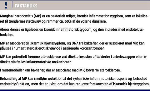I de seneste par årtier er der i Danmark observeret et stort fald i mortaliteten pga. iskæmisk hjertesygdom (IHS), men IHS er forsat blandt de hyppigste dødsårsager, og prævalensen er stigende i den øvrige vestlige verden. Det er velkendt, at aktiv infektion kan være associeret med akutte manifestationer af aterosklerose, f.eks. akut myokardieinfarkt (AMI), ligesom forhøjet koncentration af infektionsmarkører i blodet, f.eks. C-reaktivt protein (CRP), er prædiktor for IHS [1, 2]. Da IHS ikke alene kan forklares ud fra de klassiske risikofaktorer (køn, alder, rygning, arvelig disposition, hyperkolesterolæmi, hypertension, diabetes mellitus mv.), har man længe diskuteret, om der er kausal sammenhæng mellem IHS og infektion, i særdeleshed marginal parodontitis (MP), også kendt som paradentose eller parodontose [3-5]. Mange patogener kan have betydning for udvikling af aterosklerotisk sygdom, f.eks. Chlamydia pneumoniae, Helicobacter pylori og cytomegalovirus samt bakterier, der er relaterede til MP [3-6]. På baggrund af denne infektionshypotese er der udført store randomiserede forsøg med antibiotika til patienter med etableret IHS, men disse forsøg viste ikke beskyttende effekt og pegede tilmed på en mulig risiko [7]. Sammenhængen mellem infektion og aterosklerose har tidligere været omtalt i Ugeskrift for Læger, bl.a. med fokus på Chlamydia pneumomiae [8]. Siden er der imidlertid kommet flere væsentlige resultater, som støtter en association mellem MP og IHS, og vi har derfor fundet det relevant at give en status over den nuværende viden på området.
