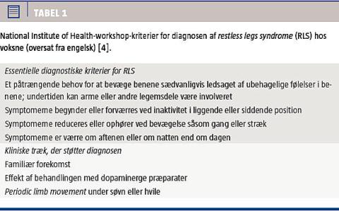 syndrome (RLS) og attention deficit hyperactivity disorder (ADHD) [1-3]. RLS er en neurologisk lidelse, der er karakteriseret ved en uimodståelig trang til at bevæge benene og ledsaget af eller forårsaget af en ubehagelig følelse i benene. Symptomerne forværres eller opstår ved hvile og kan mindskes eller ophøre helt ved bevægelse. Symptomerne er værst om aftenen og natten [4]. Ubehandlet fører tilstanden til ubehag, uro og søvnforstyrrelse, hvilket kan have konsekvenser for livskvaliteten hos både børn og voksne [4, 5].