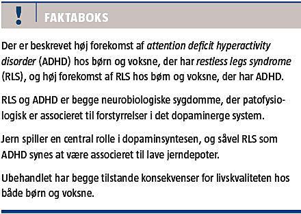 Der er tiltagende evidens for, at jernmangel (S-ferritinniveau < 12 ng/ml) er grundlag for fælles patofysiologiske mekanismer hos patienter med RLS og patienter med ADHD. I et studie med børn med ADHD fandt man RLS hos 33,3% [28]. I et mindre studie med voksne med ADHD fandt man RLS hos 20%. I dette studie syntes samtidig forekomst af RLS at forværre ADHD-symptomerne [29].
