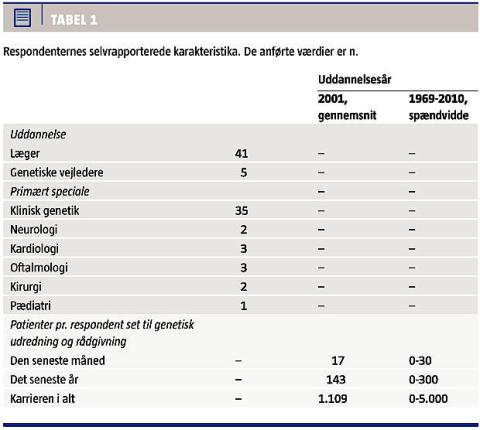 Respondenternes selvrapporterede karakteristika fremgår af Tabel 1. Femogtredive læger og genetiske vejledere med selvrapporteret primær beskæftigelse i klinisk genetik besvarede skemaet, hvilket svarer til, at ca. halvdelen af de klinisk aktive læger og vejledere i specialet deltog i undersøgelsen.