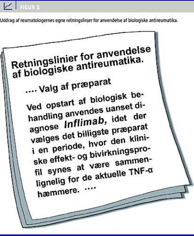 Summary Changing clinicians' prescription patterns Ugeskr Læger 2009;171(37):2655-2656 In 2005 the Central Drug Committee in co-operation with the hospitals in the county of Copenhagen (H:S) focused on the increasing use of and expenditure derived from three tumour necrosis factor alpha (TNF-alpha) inhibitors. While the three inhibitors are estimated to be equivalent regarding efficacy and safety, eternacept and adalimumab are twice as expensive as infliximab. With a little effort, the Central Drug Committee succeeded in changing clinicians' prescription pattern in a cost-effective manner.