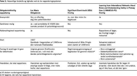 I denne artikel sættes der særlig fokus på tre overordnet forskellige rapporteringssystemer: det svenske Lex Maria med obligatorisk rapportering og uden anonymitet, det engelske Signifikant Event Audit (SEA), hvor analysen og brugen af ny viden sker og initieres inden for det enkelte lægehus, samt erfaringerne fra to pilotstudier, et fra Australien [14, 18] og et i USA. De to sidstnævnte indgår i det internationale samarbejde, der med udgangspunkt i Primary Care International Study of Medical Errors (PCISME) i 2001 dannede Learning from International Networks About Errors and Understanding Safety in Primary Care (LINNAEUS-PC). De medvirkende deltager frivilligt og rapporterer til en central database.