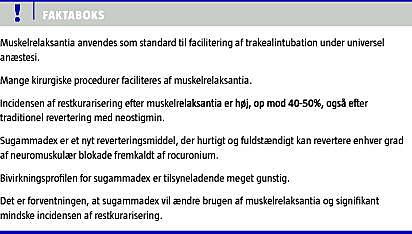Endotrakeal intubation ved elektiv kirurgi kan foretages uden brug af NMB, men NMB forbedrer intubationsforholdene og minimerer larynxtraumer [3]. I en undersøgelse med over 100.000 patienter fra Dansk Anæstesi Database fandtes endvidere større incidens af vanskelig intubation, når der ikke blev anvendt NMB [4]. Når anæstesiologer alligevel undlader brugen af NMB, er det typisk ved kortvarige kirurgiske procedurer, da anvendelsen af de korterevirkende NMB (suxamethonium og mivacurium) er forbundet med bivirkninger [5, 6]. Rocuronium har en virkningsvarighed på 1-2 timer efter en almindelig intubationsdosis (0,6 mg/kg), men variationen er stor pga. en organafhængig nedbrydning, og nogle patienter vil fortsat være delvist relakserede efter helt op til fire timer [7]. Med sugammadex kan blokaden reverteres når som helst på 2-3 min, også efter helt korte procedurer [8]. Kombinationen af rocuronium og sugammadex er således et reelt alternativ i de situationer, hvor man tidligere ville forsøge intubation uden brugen af et NMB f.eks. ved forventet kortvarig kirurgi.