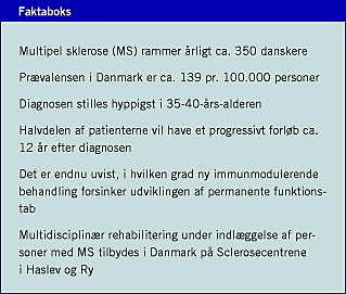 Den seneste danske, autoritative definition af rehabilitering [1] lyder: »ved rehabilitering forstås enhver faglig indsats af rådgivende, oplysende, understøttende, motiverende eller træningsmæssig karakter rettet mod en borger og dennes sociale netværk med henblik på at begrænse konsekvenserne af sygdom, ulykke eller medfødte handikap med det mål at optimere borgerens funktion og deltagelse i samfundet«. Rehabilitering af skleroseramte starter i denne forståelse af ordet ved diagnosen, hvor behovet for oplysning og rådgivning ofte er stort. Herefter melder behovet for rehabilitering sig i efterforløbet af svære attakker og i den progressive fase af sygdommen. Fysisk træning og rådgivning i brug af hjælpemidler har været grundstokken i rehabilitering siden disciplinens fremkomst i starten af 1900-tallet og har været baseret på klinisk erfaring. Først igennem de seneste 10-20 år har modellen for det kontrollerede, kliniske forsøg været appliceret på rehabilitering. Der foreligger fra de seneste år en Cochrane-analyse af effekten af fysisk træning af personer med MS [2] og en analyse af ergoterapi og MS [3]. I denne Cochrane-analyse [4] gennemgås foreliggende artikler om multidisciplinær (MD) rehabilitering af MS.