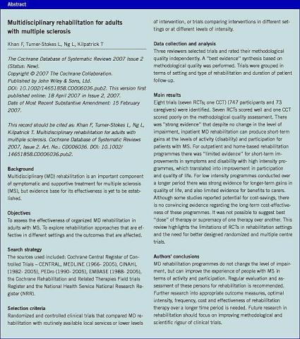 <li>Khan F, Turner-Stokes L, Ng L et al. Multidisciplinary rehabilitation for adults with multiple sclerosis. Cochrane database Sys Rev 2007(2):CD006036.</li>