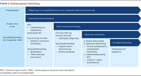 Det er essentielt med multidisciplinær tilgang, hvor der inddrages fysioterapeutisk, sexologisk samt psykoterapeutisk/psykiatrisk udredning og behandling. Dette foregår i dag i vulvaklinikker i samtlige regioner, hvor der ideelt set bør etableres et tværfagligt samarbejde med dermatologiske, gastrointestinale og urologiske afdelinger såvel som smerteklinikker, specialiserede fysioterapeuter, sexologiske klinikker og psykiater/psykoterapeuter.