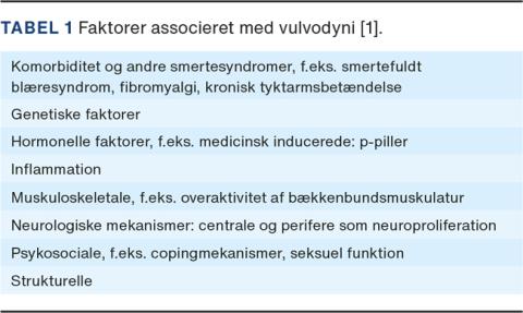 Terminologien af 2003 blev revideret i 2015 på grundlag af ti års omfattende multidisciplinære forskningsresultater. 2015-terminologien afspejler et paradigmeskifte i forståelsen og behandlingstilgangen af smerter i vulva [1]. Hidtil blev vulvodyni anset som en enten-eller-diagnose, hvor vulvasmerter blev beskrevet ud fra en specifik tilstand eller solitært defineret som ubehag i vulva. Men nu forstås vulvodyni som et resultat af en multifaktoriel proces, der kræver multidisciplinær diagnostik og behandling, med fokus på at der kan optræde associerede faktorer, som er årsag til udvikling og vedligeholdelse af vulvodyni (Tabel 1). Da andre lidelser i vulva, f.eks. dermatoser, kan være ledsaget af smerte, skal vulvodyni afgrænses i henhold til definitionen og adskilles fra veldefinerede vulvasygdomme med smerter som symptom.