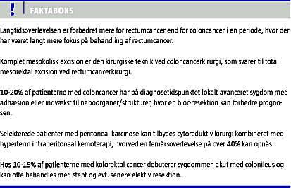Overlevelse efter colon- og rectumcancer er forbedret over tid både i udlandet og i Danmark. De største fremskridt er dog sket for rectumcancer, hvor femårsoverlevelsen på 55% for mænd nu har overhalet femårsoverlevelsen på 52% for mænd med coloncancer [1]. En tilsvarende udvikling, uafhængig af køn, er observeret i f.eks. Sverige [2]. Denne forskel må tilskrives, at der for rectumcancer har været megen fokus på at optimere kirurgien, total mesorektal excision, og prioritere det multidisciplinære samarbejde. Indførelsen af præoperativ neoadjuverende stråleterapi har udelukkende bidraget til bedre lokal kontrol [3]. En sådan udvikling er ikke sket for coloncancer. De seneste år er der dog kommet fokus på betydningen af den mesokoliske excision ved coloncancer. Herudover er der ved coloncancer tre områder, der giver særlige udfordringer for behandlerne: lokalt avanceret coloncancer, coloncancer med lokal karcinose og patienter som debuterer akut med ileus eller perforation. Disse forhold gennemgås nedenfor.