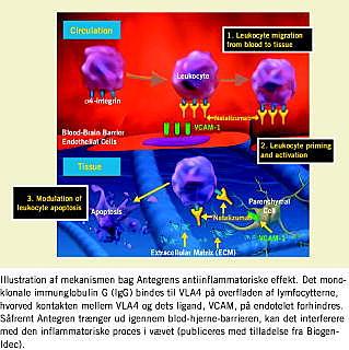 To store fase III-undersøgelser af en ny behandlingsform er tæt på at afsluttes. Stoffet, som i studieperioden har båret navnet Antegren, er et monoklonalt antistof, der er rettet mod VLA4, et adhæsionsmolekule på overfladen af aktiverede lymfocytter, som gør det muligt for disse at adhærere til endotelet for siden at trænge ud i det omgivende væv. Denne diapedese er en væsentlig mekanisme i udviklingen af inflammation. Lymfocytter, som er »imprægneret« med Antegren kan ikke adhærere til karvæggen, hvorved inflammationen begrænses. Antegren gives intravenøst en gang om måneden. Foreløbig foreligger der kun etårsdata, som viser en reduktion af attakhyppigheden med 68% i forhold til placebo og relativt få og acceptable bivirkninger. Den væsentligste usikkerhed knytter sig til eventuelle bivirkninger ved længere tids behandling. Stoffet er netop blevet godkendt af Food and Drug Administration (FDA) og markedsført i USA under navnet Tysabri på betingelse af at også toårsdata viser sig at være positive. Disse forventes offentliggjort i marts 2005, og Tysabri vil formentlig være tilgængeligt i Europa i løbet af efteråret 2005.