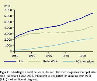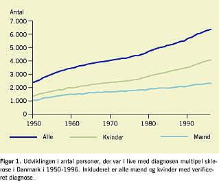 Resultater: I observationsperioden steg antallet af diagnosticerede MS-patienter fra 2.387 til 6.445. For kvinder steg antallet fra 1.353 til 4.122 og for mænd fra 1.034 til 2.323. Prævalensproportionen pr. 100.000 steg fra 62,9 til 154,8 for kvinder, fra 48,8 til 89,4 for mænd og samlet for begge køn fra 55,9 til 122,5. Andelen af patienter på 60 år eller mere steg fra 10% til 33% i observationsperioden. Der sås intet mønster i den geografiske fordeling af prævalens.
