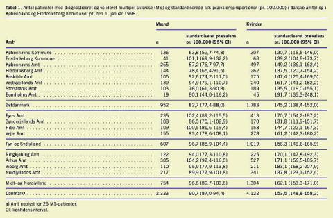 Materiale og metoder: Det Danske Scleroseregister indeholder data om alle danskere, som har fået stillet en MS-diagnose efter 1921, og som var i live i 1948 eller havde fået stillet diagnosen i perioden 1949-1996. Undersøgelsen omfatter 13.144 patienter med en valideret MS-diagnose, 5.383 mænd og 7.761 kvinder. Prævalensen blev beregnet for hvert år i perioden 1950-1996. For alle amter samt Københavns og Frederiksberg Kommuner beregnedes prævalens pr. 1. januar 1996.