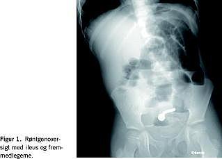 En seks år gammel autistisk dreng blev indlagt med opkastninger og manglende afføring gennem halvandet døgn. Ved den kliniske undersøgelse var han akut smertepåvirket og urolig. Ved abdominal palpation fandtes diffus ømhed og mete-orisme, og ved auskultation hørtes metalliske tarmlyde. Para-klinisk var der let forhøjelse af leukocyttallet til 18 mia./l og normal C-reaktivt protein. En røntgenundersøgelse (oversigt) af abdomen viste tyndtarmsileus og et formentlig metallisk fremmedlegeme i det lille bækken (Figur 1 ).