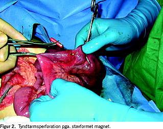 Ved operationen fandt man i det lille bækken et tarmkonglomerat, som var holdt sammen af flere små magnetiske legetøjsdele. Drengen havde slugt i alt fire magneter (tre stave og en kugle), som havde forårsaget otte tarmvægsnekroser med perforation, seks på tyndtarmene (Figur 2 ), en i colon transversum og en i rectum. Der blev udført peroperativ koloskopi, hvor legetøjet (kuglen) og en slimhindelæsion kunne ses i rectum. Ved en luftprøve blev det afsløret, at der var perforation. Den stærke magnetisme mellem stavene og kuglen havde endvidere forårsaget en kort nekrotisk snørefure på ileum, som måtte resekteres. Der var ingen væsentlig forurening, og de øvrige små perforationshuller kunne sutureres. Ved røntgengennemlysning blev det sikret, at der ikke var flere fremmedlegemer. Under operationen blev der påbegyndt en bredspektret antibiotikabehandling. Det postoperative forløb var ukompliceret, og drengen blev udskrevet ti dage senere. Han blev dog kortvarigt genindlagt tre dage efter på mistanke om overfladisk sårinfektion.