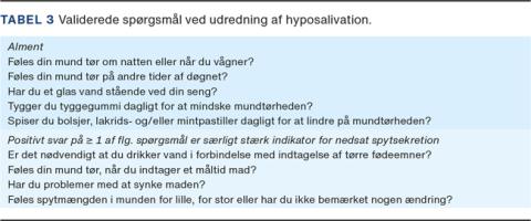 Tabel 3 viser typiske symptomer ved hyposalivation, og det er relevant at spørge, om patienten har disse symptomer bl.a. ved hjælp af validerede spørgeskemaer, som kan bidrage til at afklare sværhedsgraden af mundtørheden og effekt af behandlingen [1].