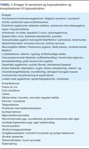Spytkirteldysfunktion er betegnelsen for ændringer i spyttets kvantitet og/eller kvalitet, hvilket hyppigst kommer til udtryk som hyposalivation og xerostomi [3]. Hyposalivation og ændringer i spyttets sammensætning kan føre til invaliderende symptomer som smerter i mundslimhinden og følgetilstande som caries, oral candidose, fejlernæring og foetor ex ore, hvilket kan føre til forringet livskvalitet og social distancering pga. besvær med at tale, spise, synke og sove [4]. Den hyppigste årsag til xerostomi er indtagelse af visse xerogene lægemidler [1]. Xerostomi er også et prominent symptom ved en lang række sygdomme, især Sjögrens syndrom, og ved strålebehandling af cancer i hoved-hals-regionen [4-6]. Mundtørhed kan desuden ses ved stress, angst og en række lokale spytkirtelsygdomme [3, 4]. Formålet med denne artikel er at præsentere et overblik over de hyppigste årsager til xerostomi og hyposalivation samt udredning og behandling af disse.
