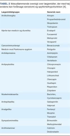 Ved mistanke om lægemiddelinduceret xerostomi skal man overveje reduktion af dosis eller eventuelt ændring af præparatet til et andet, som ikke er xerogent [6] (Tabel 4).