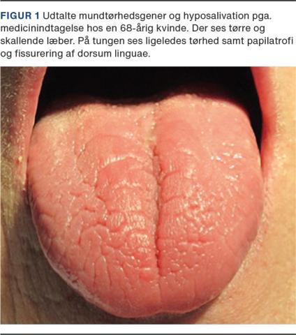 Ved inspektion ekstraoralt bemærkes tørhed, fissurering af læber og angulær keilitis. De store spytkirtler inspiceres, og evt. hævelse skal bemærkes. Intraoralt ses der efter fissurering eller lobulering af dorsum linguae [23] (Figur 1). Den tilstedeværende spytmængde og konsistens vurderes: Er spyttet sejt og tråddannende? Fremtræder mundslimhinderne velbefugtede eller hænger træspatel/instrument fast i kindslimhinden? Er der tegn på slimhindeforandringer? Fremtræder slimhinderne pergamentagtige? Der foretages bidigital palpation af de store spytkirtler og deres udførselsgange, og der undersøges for, om der kan eksprimeres spyt fra udførselsgangene, og om der kan palperes patologi lokalt.
