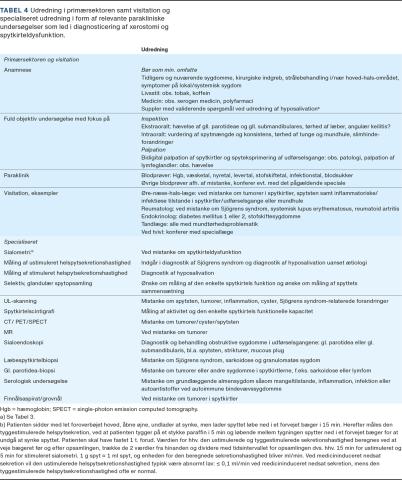 I udredning af mundtørhed bør der indgå overvejelser om, hvorvidt tilstanden skyldes tidligere strålebehandling/kirurgi, bivirkning af medicin, lokale spytkirtelsygdomme eller er sekundær til systemisk sygdom samt, om der er ledsagende spytkirteldysfunktion (Tabel 1).