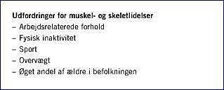 Summary Muscle and skeletal disorders Ugeskr Læger 2004;166:1331-1333 Muscle and skeletal illnesses and complaints are the most common disorders in the population. They occupy considerable resources in the health care system and are the most frequent cause of long-term sick leave. Their consequences are long-term restrictions, change of job or retirement from work. Further, they are the second most frequent reason for taking early retirement allowance and constitute half of reported work-related diseases. Risk indicators are work-related exposures, inactivity, sport, overweight and the increased proportion of elderly inhabitants. Primary preventive measures to decrease musculoskeletal disorders can be taken in workplaces, on sports fields, etc. In addition, an increase in general muscle-skeletal fitness together with specific awareness about the challenge presented by obesity is of specific importance.