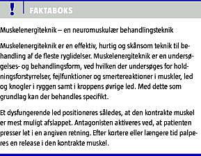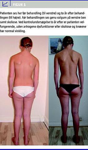 På grund af vedvarende smerter og hæmmet gangfunktion blev patienten 11 år gammel undersøgt på en klinik for muskuloskeletal medicin (MM). Hendes haltende gang med flekteret og adduceret venstre ben medførte bl.a. at hun ikke kunne løbe. Man fandt et låst articulus tibiofibularis proximalis (TF) sin og genu valgum. I lænden blev der fundet et skævt bækken med en retroverteret højre bækkenhalvdel, S-formet skoliose, samt et låst articularis sacro-illiaca sinister og et låst højre facetled på 5. lændehvirvel. Efter tre behandlinger med muskelenergiteknik havde bækkenet normaliseret sig, og dysfunktionerne var væk (se Figur 1). Patienten kunne herefter gå normalt uden smerter. Ved efterfølgende kontrol hos ortopædkirurg blev der noteret i journalen »Hun kan nu stå med helt strakte knæ. Der er næsten ingen hasemuskelstramning ...«