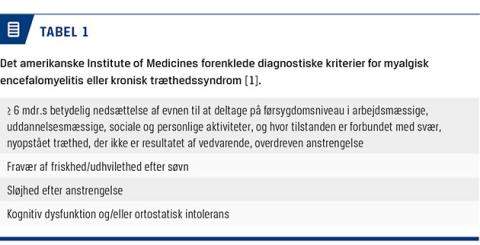 Myalgisk encefalomyelitis (ME) og kronisk træthedssyndrom (CFS) er tilstande med stort overlap og vil herefter blive beskrevet under et (ME/CFS). ME/CFS er en ofte invaliderende kronisk lidelse, der er karakteriseret ved svær træthed/udmattelse og trætbarhed, kognitiv dysfunktion, søvnforstyrrelser, smertetilstande samt autonome, immunologiske og metaboliske funktionsforstyrrelser – hvor alle symptomer typisk forværres ved fysisk og/eller psykisk belastning [1]. Prævalensen af ME/CFS er svær at estimere, men i et dansk befolkningsstudie rapporterede omkring 1% af deltagerne, at de havde fået diagnosen CFS [2].