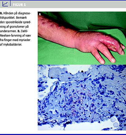 Pga. furunkler på underarmen blev patienten henvist til dermatologisk afdeling, hvor han oplyste, at han passede sin venindes akvarium, og der opstod mistanke om diagnosen M. marinum (Figur 1 A). Der blev foretaget Quantiferontest, stansebiopsi til mikroskopi, polymerasekædereaktion og dyrkning for mykobakterier samt biopsi til histologi. På mistanken blev patienten dagen efter sat i behandling med rifampicin, ethambutol og clarithromycin. En uge efter var cirkumferensen af fingeren aftaget med en tredjedel. Vævsbiopsierne fra tidligere operation blev fundet frem og Ziehl-Neelsen-farvning viste myriader af syrefaste stave (Figur 1B). Quantiferontesten var negativ.