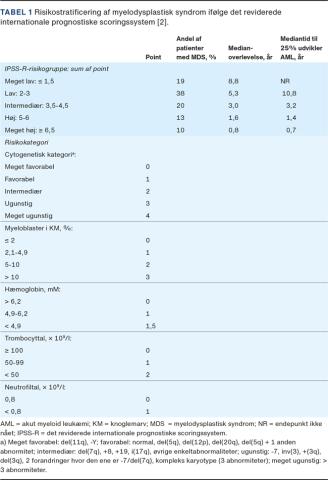Cytogenetik udgør den vigtigste prognostiske faktor for både patienter med MDS og patienter med AML, men suppleres af anden information. Prognosen ved MDS kan belyses vha. det reviderede internationale prognostiske scoringssystem IPSS-R [1, 2]. I IPSS-R inddeles patienterne i fem risikokategorier med medianoverlevelse fra få måneder til ni år (Tabel 1) [1, 14]. Den prognostiske betydning af mutationers forekomst er ikke fuldt afklaret, men flere mutationer (f.eks. TP53) er associeret med overlevelse og/eller risiko for transformation til AML [15].