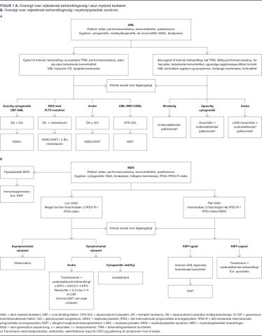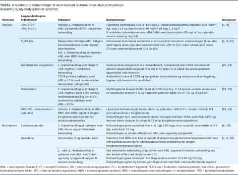 Nye behandlingsformer er indført til udvalgte patienter. Gemtuzumab ozogamicin (GO) er et rekombinant, humaniseret anti-CD33 monoklonalt antistoflægemiddelkonjugat med det aktive lægemiddel calicheamicin. GO er godkendt i tillæg til DA til behandling af CD33-positiv AML uden ugunstig risikoprofil, hvor det er påvist, at det har medført signifikant forbedret langtidsoverlevelse [20]. CPX-351 er en liposomal formulering af DA, som akkumuleres i knoglemarven og er godkendt til behandling af tAML og AML med myelodysplastiske forandringer (AML-MRC). CPX-351 har vist signifikant højere responsrater og dermed øget mulighed for at bringe patienter til KMT sammenlignet med DA [21]. Patienter med FLT3-mutationer udgør 25-35%, oftest som internal tandem duplication i juxtamembrandomænet (FLT3-ITD), sjældnere som punktmutation i tyrosinkinasedomænet (FLT3-TKD). Disse patienter er karakteriseret ved at have prolifererende sygdom med højt leukocyttal og stor tumorbyrde i knoglemarven [22]. FLT3-ITD er associeret med øget risiko for relaps. Midostaurin er en multikinaseinhibitor, som er godkendt som tillæg til DA til patienter med FLT3-mutation, da studier har vist signifikant øget overlevelse hos patienter, som har AML og er < 60 år. Andre FLT3-inhibitorer er under afprøvning [23–25].