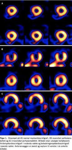 Hvile- og belastningsundersøgelsen blev analyseret samtidig ved visuel vurdering og ved sammenligning med referencedatabase [3, 4]. Resultatet af MPI blev registreret som enten normale forhold, irreversibel perfusionsdefekt, reversibel perfusionsdefekt eller kombineret irreversibel og reversibel perfusionsdefekt. Sidstnævnte er inkluderet i gruppen af patienter med reversibel perfusionsdefekt (Figur 1 ).