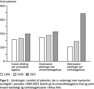I perioden 1999-2001 fik 1.673 patienter udført MPI. I alt 515 patienter (31%) var henvist fra Skejby Sygehus (invasiv afdeling ved universitetssygehus), 569 patienter (34%) fra Århus Amtssygehus (ikkeinvasiv afdeling ved universitetssygehus) og de resterende 589 patienter (35%) va r henvist fra øvrige sygehuse i Århus Amt (ikkeinvasive afdelinger ved centralsygehuse) (Figur 2 ). Fra 1999 til 2001 steg det samlede undersøgelsestal fra 426 til 754 pr. år, hvilket er en stigning på 77%. Stigningen var størst for centralsygehusene, hvor antallet af henviste patienter steg med 234%. Fra den invasive afdeling var stigningen 28%.