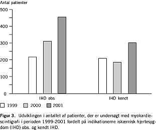 I undersøgelsesperioden steg antallet af patienter, der var henvist på indikationen IHD obs, væsentligt mere end antallet, der var henvist med diagnosen IHD kendt. Stigningen fra 1999 til 2001 udgjorde henholdsvis 107% og 45% (Fig. 3). Dette gjorde sig gældende for alle henvisende afdelinger.