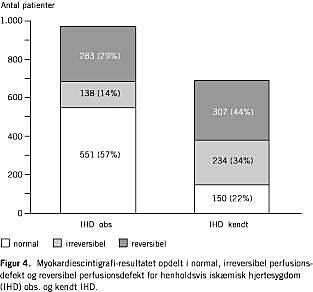Det ses af Figur 4 , at over halvdelen (57%) af de patienter, der var henvist på indikationen IHD obs, havde normale forhold undersøgt ved MPI mod kun 22% af dem, der var henvist på indikationen IHD kendt (p < 0,05).