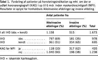 Resultater: Undersøgelsen omfatter 1.673 patienter. I perioden steg antallet af henviste patienter med 77%. Fra ikkeinvasive afdelinger var 69% af patienterne henvist på mistanke om iskæmisk hjertesygdom. 10% havde fået udført KAG. Fra afdelingen med invasivt kardiologisk laboratorium var 35% blevet henvist på mistanke om iskæmisk hjertesygdom. 62% havde fået udført KAG. Af patienter, der var henvist på mistanke om iskæmisk hjertesygdom, havde 57% normale forhold undersøgt ved MPI. Heraf blev 7% efterfølgende henvist til KAG. Af patienter med reversibel defekt blev 59% henvist til KAG.