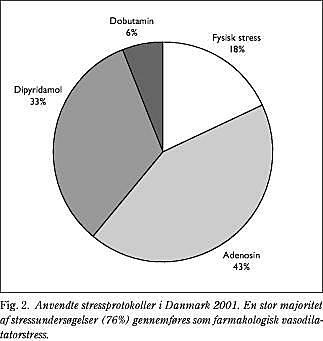 Alle afdelinger, som udførte MPS, anvendte technetium-99m-mærkede flowtracere (tetrofosmin eller sestamibi), og samtlige benyttede tomografisk optageteknik. Billedrekonstruktion fandt sted med iterativ teknik på otte afdelinger og med filtreret tilbageprojektion på 11 afdelinger. Ekg-synkroniseret billedoptagelse blev benyttet på 14 afdelinger. På seks afdelinger benyttede man dæmpningskorrektion. Af samtlige udførte stressundersøgelser i 2001 blev der benyttes adenosin eller dipyridamol i 76%, cykelbelastning i 18% og dobutamin-infusion i 6% af undersøgelserne (Fig. 2 ).