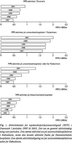 Diskussion: I Danmark er der udtalte regionale variationer i forbruget af MPS. Den laveste aktivitet i forbruget blev observeret ved ikkeuniversitetshospitaler uden for København, mens den højeste aktivitet fandt sted ved universitetshospitaler i København. I Danmark som helhed er undersøgelsesaktiviteten fordoblet fra 1997 til 2001. På trods af denne markante øgning synes aktiviteten stadigvæk at være for lav og utilstrækkelig til at opfylde behovet hos hjertesyge patienter.