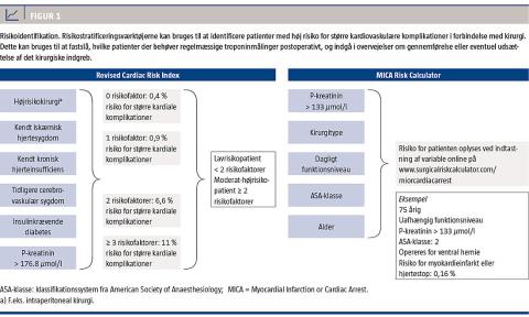 Revised Cardiac Risk Index har i mange år været det mest anvendte værktøj til vurdering af risikoen for perioperative kardiovaskulære komplikationer [26] (Figur 1). Indekset er kritiseret for at være baseret på et begrænset datamateriale og ikke at omfatte akut kirurgi, som er en af de stærkeste prædiktorer for perioperative kardiovaskulære komplikationer [4]. American College of Surgeons har med en multicenterdatabase med over 250 hospitaler udviklet et nyt stratificeringsværktøj ved gennemgang af over 200.000 ikkekardiale kirurgiske patienter [27] (Figur 1). Denne stratificering har ift. Revised Cardiac Risk Index vist sig at være overlegen til prædiktion af risikoen for PMI og hjertestop efter ikkekardial kirurgi.
