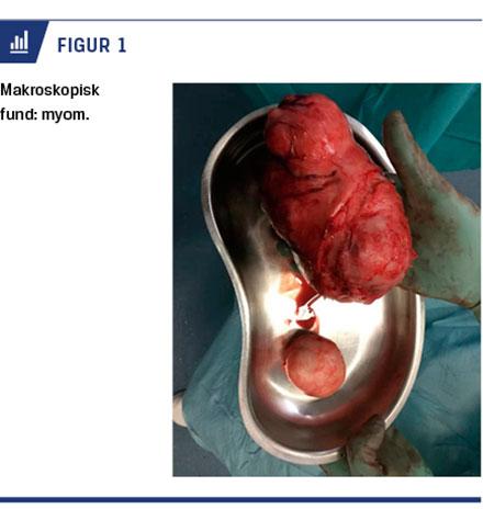 S-hæmoglobinniveauet var 7,5 mmol/l ved ankomsten. Patienten blev observeret natten over. Over de følgende 12 timer faldt hæmoglobinniveauet til 4,5 mmol/l trods intravenøs indgift af tranexamsyre. Der blev målt negativ urin-humant choriongonadotropin og CA-125 på 16 kIU/l (normal). For at sikre hæmostase blev der foretaget diagnostisk laparoskopi på mistanke om en tumor med blødning. En laparoskopi viste et stort fibrom udgående fra fundus og bagvæggen af uterus med store varikøse karstammer, hvorfra der var blødning. Pga. fibromets størrelse, dårligt overblik og insufficient hæmostase med bipolær diatermi blev der konverteret til laparotomi. Der blev foretaget myomektomi af to fibromer med en samlet vægt på 588 g (Figur 1). Den samlede blødning var på i alt ca. 2.000 ml (præ- og peroperativt).
