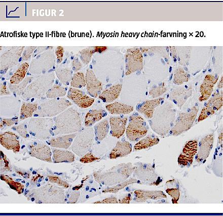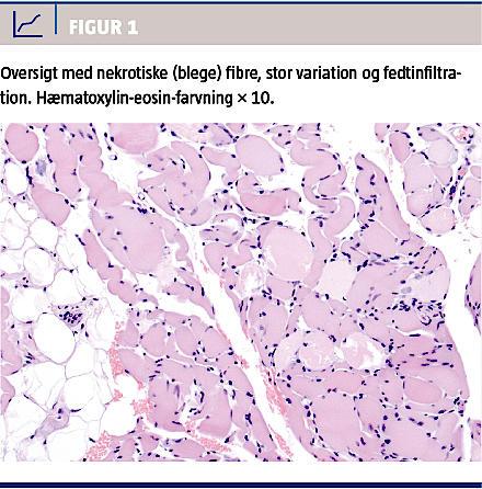 Muskelbiopsi fra venstre m. biceps brachii viste svære degenerative forandringer primært i type II-fibre. I mange fibre fandt man manglende tværstribning, udtalt makrofaginfiltration og massiv fedtinfiltration (Figur 1 og Figur 2). Efter 63 døgn blev patienten udskrevet til hjemmet i generelt selvhjulpen tilstand.