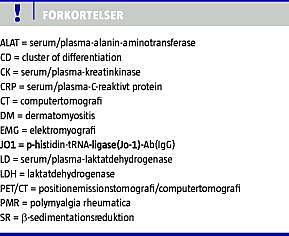 Der var ikke set karakteristisk hududslet og anti-P-histidin-tRNA-ligase(Jo-1)-Ab(IgG) (Anti-Jo-1) var negativ. Prednisolonbehandlingen blev øget til 50 mg dagligt, hvorefter muskelenzymerne faldt, og den kliniske tilstand forbedredes. Patienten kunne nu løfte sine arme, rejse sig fra en stol, følte sig mindre træt, og vægten stabiliserede sig.