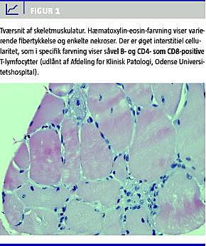 Muskelbiopsi (Figur 1 ) viste akut muskelskade med regeneration og øget interstitiel cellularitet med forekomst af både cluster of differentiation CD4- og CD8-positive lymfocytter uden invasion af T-celler i muskelfibrene, hvilket var foreneligt med DM.