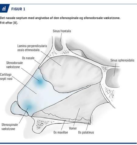 Børns næser er strukturelt forskellige fra voksnes, bl.a. består det nasale septum hos børn udelukkende af kartilaginøst væv. Næsespidsen er desuden let eleveret, hvilket resulterer i en øget nasolabial vinkel, som er karakteristisk for det lille barns ansigt [1, 9, 10]. Gennem opvæksten undergår næsen markante forandringer, især ændres mængden af brusk og dermed næsens eftergivelighed. Efterhånden som barnet vokser, færdigudvikles det nasale septum, og det kartilaginøse væv i bagerste del af det nasale septum ossificerer og danner lamina perpendicularis ossis ethmoidalis, som fusionerer med vomer i 6-8-årsalderen [11] (Figur 1).