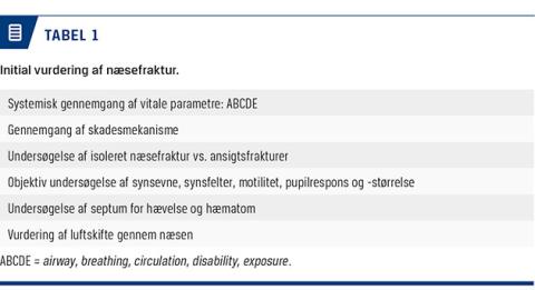 Ved den primære kontakt vurderes initialt de vitale parametre (airway, breathing, circulation, disability, exposure (ABCDE)) afhængigt af traumemekanismen og almentilstanden [13] (Tabel 1). Man bør være opmærksom på, at et traume mod næsen kan medføre nasal obstruktion og/eller posterior blødning ned i svælget, hvilket kan nødvendiggøre akut behandling [6]. Blødning fra næsen er hyppig ved nasalt traume, oftest fra locus Kiesselbachii fortil på det nasale septum [1].