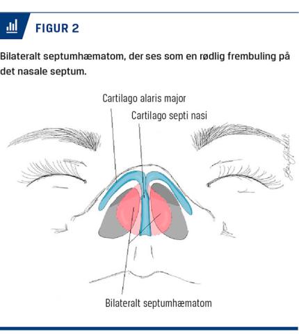Cavum nasi undersøges i passende belysning, evt. ved hjælp af nasal endoskopi. Der foretages en grundig undersøgelse af det nasale septum for brud, lateral forskydning, hævelse og septumhæmatom [1]. Sidstnævnte ses som en rødlig hævelse af slimhinden over det normalt faste kartilaginøse nasale septum, ofte ledsaget af nasal obstruktion og smerter [1, 15] (Figur 2). Septumhæmatom ses oftere hos børn end hos voksne [8].