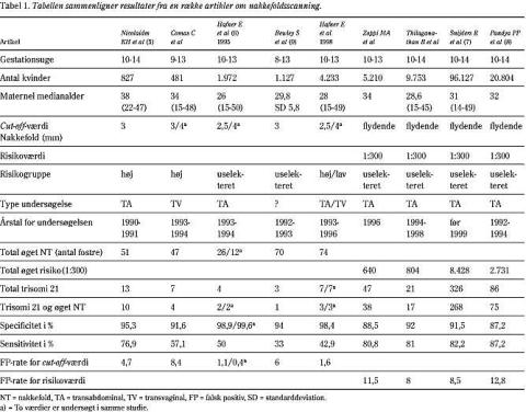 Valget af, ved hvilken størrelse nakkefolden skal defineres som patologisk, er vigtig for både sensitiviteten og falsk positiv-raten. Dette er belyst i et arbejde fra 1995 (6), hvor man vurderede sensitiviteten og falsk positiv-raten ved en nakkefold på henholdsvis 2,5 mm og 4 mm. Man fandt samme sensitivitet, men forskellig falsk positiv-rate som udtryk for, at der blev fundet det samme antal fostre med Downs syndrom.